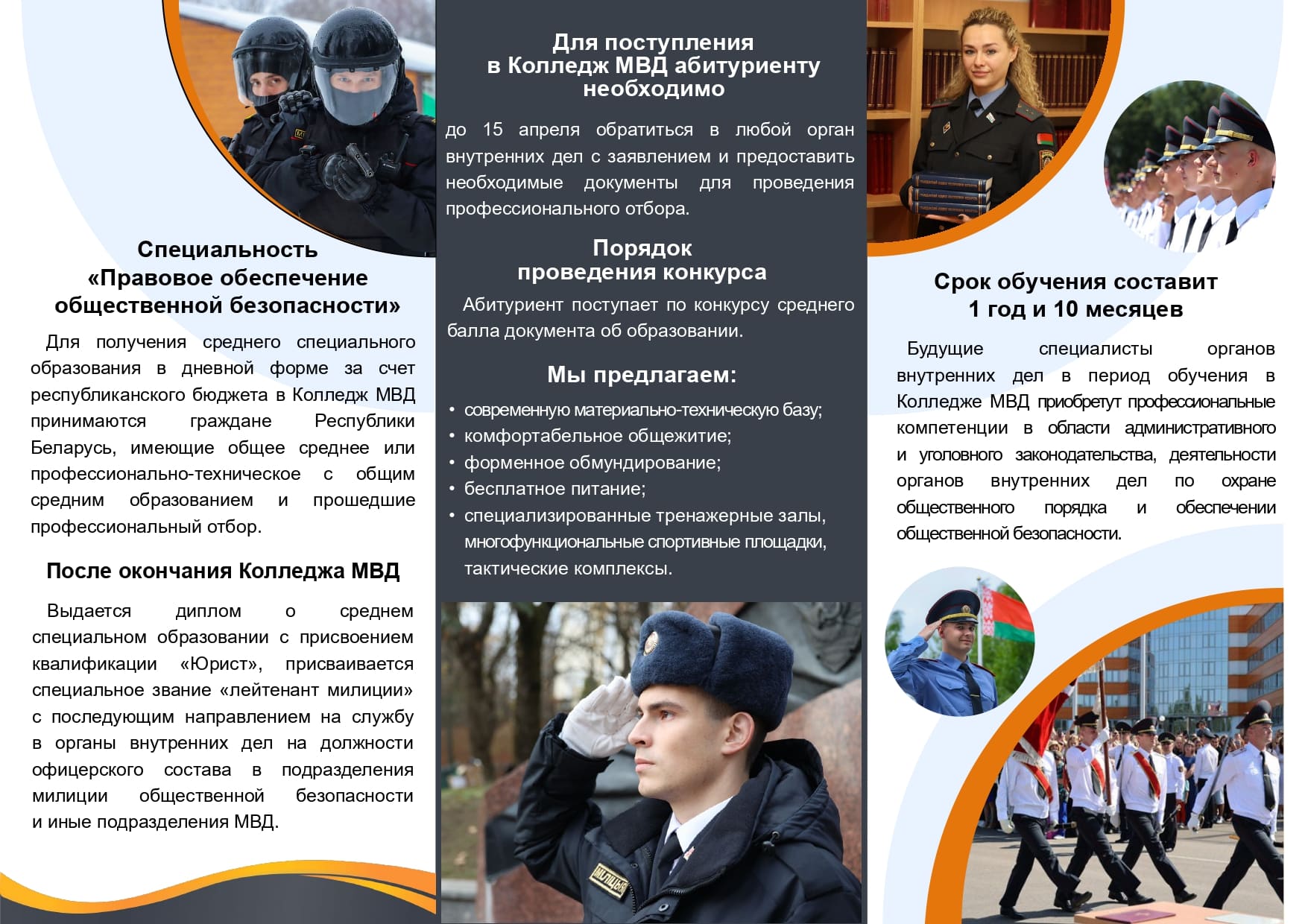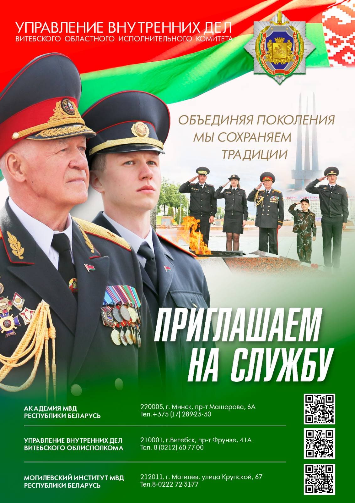 Каждый, кто выбирает службу в органах внутренних дел, совершает осознанный шаг к благородному делу по защите жизни и здоровья граждан, интересов общества и государства от преступных и иных противоправных посягательств. На службу в органы внутренних дел принимаются граждане в возрасте до 28 лет, имеющие общее среднее, профессионально-техническое, среднее специальное либо высшее образование (в зависимости от предполагаемой должности). Не привлекавшиеся к уголовной ответственности. Признанные военно-врачебной комиссией годными к службе в органах внутренних дел. Самое главное - способные по своим моральным и деловым качествам выполнять задачи по защите жизни, здоровья, чести, достоинства, прав, свобод и законных интересов граждан, интересов общества и государства от преступных и иных противоправных посягательств. Более подробную информацию можно узнать на официальном сайте УВД Витебского облисполкома.