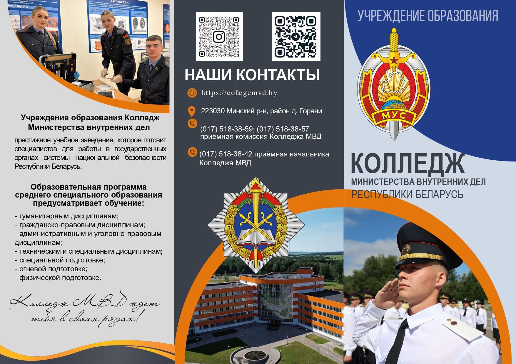 Подготовку квалифицированных специалистов для органов внутренних дел в очной форме обучения осуществляют два ведомственных высших учебных заведения нашего министерства: учреждение образования "Академия МВД Республики Беларусь" иучреждение образования "Могилевский институт МВД Республики Беларусь". После окончания выпускники милицейских ВУЗов получают диплом о высшем юридическом образовании с присвоением квалификации «юрист» или «юрист со знанием экономики», а также приказом Министра внутренних дел им присваивается первое офицерское специальное звание «лейтенант милиции».