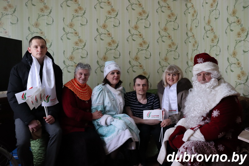 Тепло души, подарки и общение ждут все взрослые. Особое внимание в эти дни — инвалидам, людям, проявившим стойкость и выдержку, упорство и настойчивость. Дубровенское районное общество инвалидов, ТЦСОН и студия «Сердечные встречи» РДК совместно с представителями Белорусской партии «Белая Русь» посетили семьи, где заботятся о близких, попавших в трудную жизненную ситуацию. Отрадно, что поддержали акцию и оказали помощь в приобретении подарков и сувениров руководители ОАО «Герой» Петр Сыса, ОАО «Дубровенский льнозавод» Анатолий Босенков, ОАО «Дубровенский райагросервис» Дмитрий Тимощенко, а также предприниматели Светлана Пахомова и Елена Титаренко.