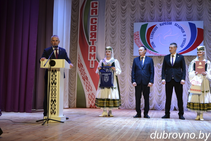 К собравшимся в зале с приветственным словом обратился председатель Дубровенского райисполкома Олег Макаревич, который напомнил, что 2 апреля 1996 года Республика Беларусь и Российская Федерация, основываясь на исторически сложившейся общности судеб белорусов и россиян, опираясь на волю наших народов к дальнейшему сближению, подписали Договор об образовании Сообщества Беларуси и России.
