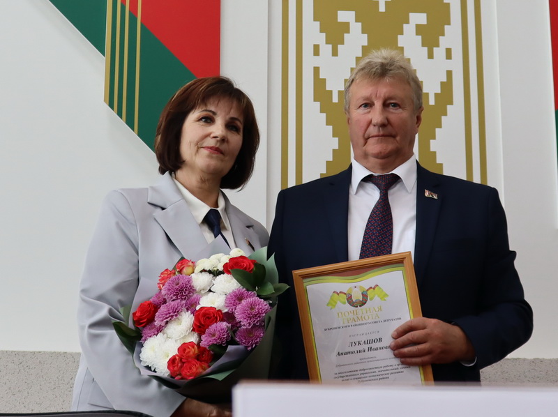 Глава региона и председатель районного Совета депутатов Елена Тихонова поблагодарили экс-председателя Дубровенского райисполкома Анатолия Лукашова, более 17 лет руководившего районом, высказали слова благодарности за добросовестный труд и вручили Почетные грамоты.