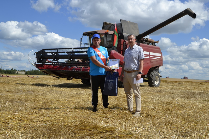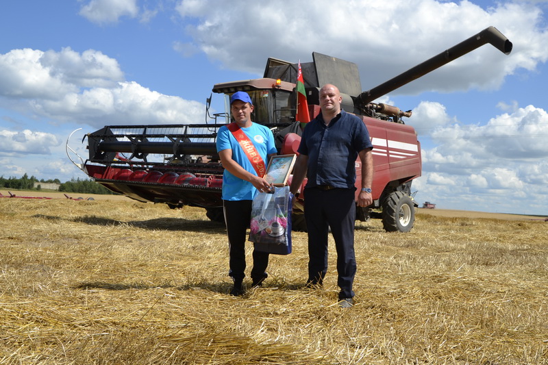 В горячий — и по температуре, и по трудовом у накалу — полдень на поле озимой пшеницы рядом с деревней Теолин чествовать героя жатвы приехал Анатолий Лукашов, председатель Дубровенского райисполкома, председатель Дубровенского райкома АПК Александр Маленков, молодой руководитель СХФ им.Ю.Смирнова Михаил Вожлаков. В адрес Артема звучали слова благодарности и пожелания дальнейших трудовых успехов.