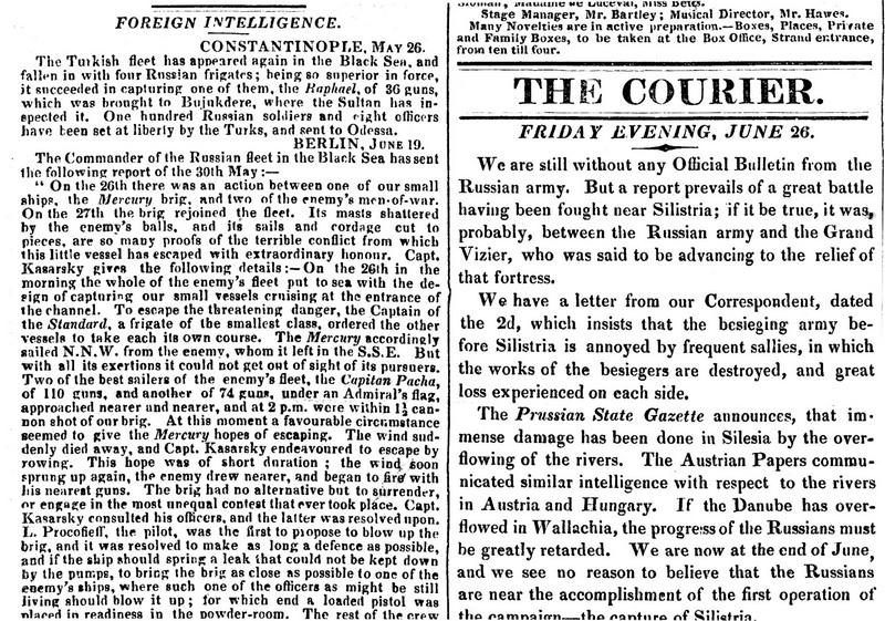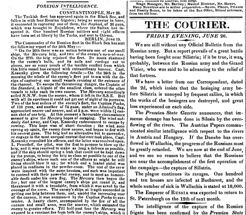Далее в газете «The_Courier» для большей убедительности приводится следующее сокращенное изложение из чужой перепечатки: «…БЕРЛИН, 19 ИЮНЯ. Командующий российским флотом в Черном море прислал … следующий отчет от 30 мая [Можно было бы даже подумать, что командующий лично докладывал газете «The_Courier. К тому, пытаясь скрыть от читателя чужую перепечатку, в номере даже не указано кому и зачем он «прислал … отчет»]: «…26-го произошло сражение между одним из наших маленьких кораблей, бригом Меркурий, и двумя вражескими. На 27-е бриг вернулся во флот. Мачты его были разбиты ядрами противника, а паруса и канаты, порванные в куски, являются доказательствами ужасного сражения, из которого сбежал этот маленький корабль с необычайной честью. Капитан Казарский дал следующие подробности … 26 утра весь флот противника вышел в море с десантом для захвата наших маленьких судов, плавающих в проходе пролива. Чтобы избежать угрожающей опасности, капитан фрегата Штандарт, фрегат наименьшего класса, приказал другим судам [бригам «Меркурий» и «Орфей»] следовать по своему курсу. Меркурий, соответственно, отплыл по своему, но со всеми его усилиями он не мог уйти из виду, преследующих. Два из трех-дечных парусников вражеского флота, Capitan Pacha [«Силемие»], из 110 орудий, и еще один, названный «Реал-бей» из 74 орудий под адмиралтейским флагом, приближались все ближе и ближе, и по-полудни были на выстрел нашего брига. На данный момент благоприятное обстоятельство, казалось, дало Меркурию надежду на побег. Ветер сдул, и капитан Казарский постарался убежать греблей, но он не смог. Эта надежда была недолгой, ветер снова поднялся, враг приблизился и начал стрелять из ближайших орудий. Ситуация не имела другого выбора, кроме как сдаться или вступить в самую невероятную дуэль, которая когда-либо имела место [*это — оценка прусской газетой сложившейся ситуации, запомним ее]. Капитан Касарский [так в газете] посоветовался со своими офицерами, и последний был принят. Штурман Прокофьев первым предложил взорвать бриг, и было решено держать как можно более длинную оборону, а если судно даст течь, что не может быть удержано насосами, привести бриг как можно ближе к одному из кораблей противника, где бы один из офицеров, который еще мог быть жив, должен взорвать его; В конце сражения заряженный пистолет был положен в готовности в пороховой. Остальная часть экипажа была вдохновлена тем же самым, и было принято решение упорно бороться со своим мощным врагом и встретить достойный исход под собственным флагом. Меркурий начал огонь, но один из самых больших кораблей противника обошел его и угрожал абордажем, от которого был спасен мужеством экипажа. Вражеским кораблям удалось перехватить наш бриг между ними, и, среди всевозрастающего грома пушек, он был вызван капитаном пашей, чтобы подчиниться. Искренний крик, сопровождаемый огнем всех пушек и стрелкового оружия, был ответом, который вдохновил врага на большее усилие. До половины четвертого Меркурий был подвержен постоянному огню с обоих кораблей противника, который он разогнал с максимальной твердостью, стараясь во всех возможных маневрах избежать его последствий. Одна из гранат противника даже подожгла нас, но экипаж сумел избежать пожара. Примерно в это время героическое решение Меркурия было увенчано блестящим успехом. Он повернул с