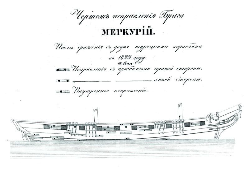 Второе, к вопросу о том, бриг «сбежал» или не сбежал с поля боя. В архивах РГИА, РГА ВМФ сохранились рапорты, свидетельства очевидцев, чертежи повреждения и схемы этого боя. В частности сохранились чертежи Осминина, автора проекта брига, на которых отображены и классифицированы повреждения брига «Меркурий», полученные в бою 14.05.1829 года [Дадатак 4]. Позволительно ли было газете таким недостойным словом «сбежал» оценивать экипаж брига, отважившегося принять бой с двумя линейными кораблями, многократно превосходящими его по вооружению, получившего в нем серьезные повреждения, но также нанесшего врагу неприемлемый урон, заставившего турок изменить свое намерение пленить судно и им самим выйти из боя? Ответ здесь очевиден.