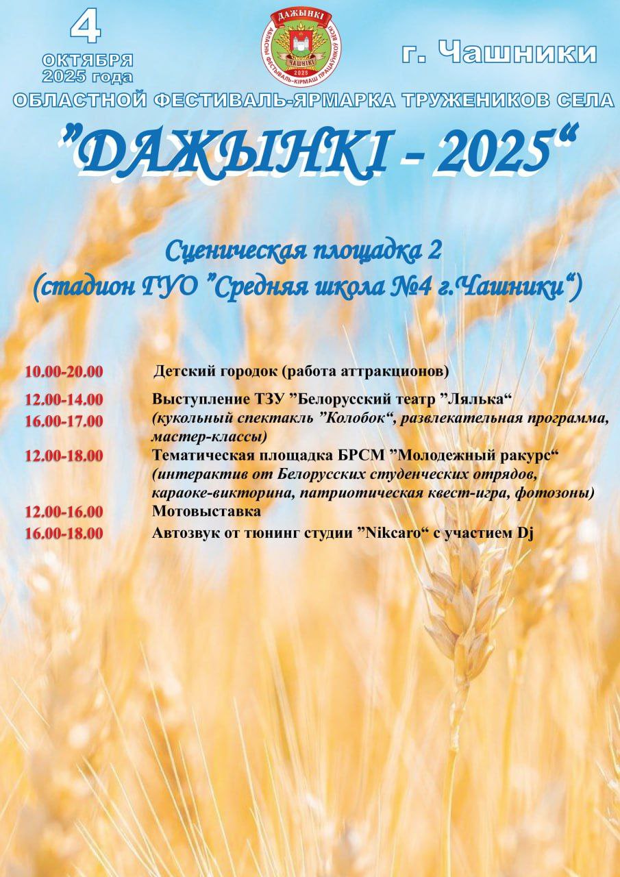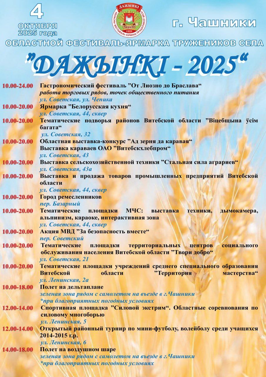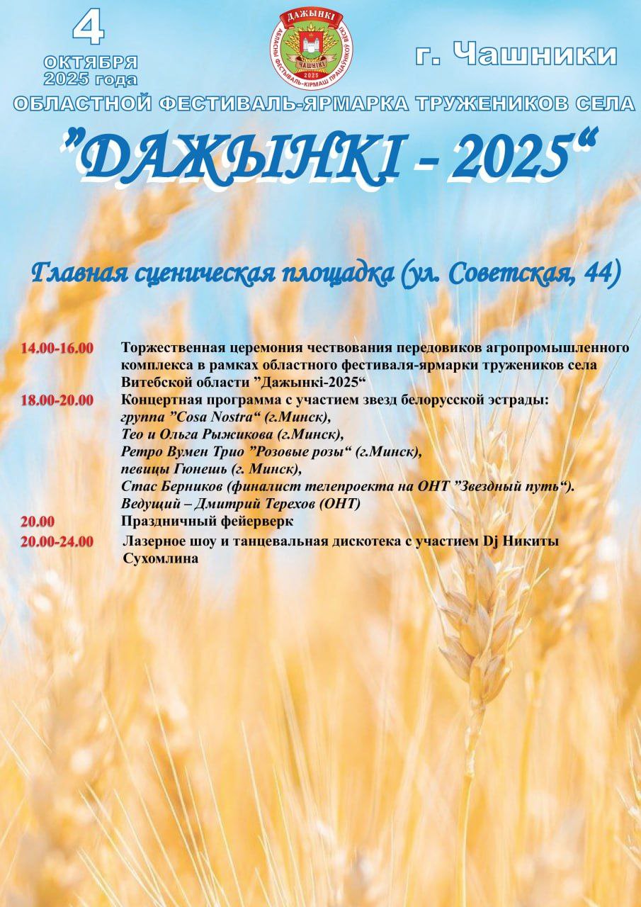 4 октября в Чашниках состоится областной фестиваль-ярмарка тружеников села «Дажынкi-2025». Гостей праздника ждет насыщенная программа: от гастрономических изысков и выставок достижений аграриев до концертов звезд белорусской эстрады и развлечений для всей семьи.